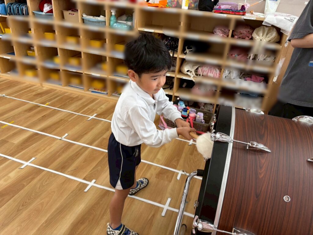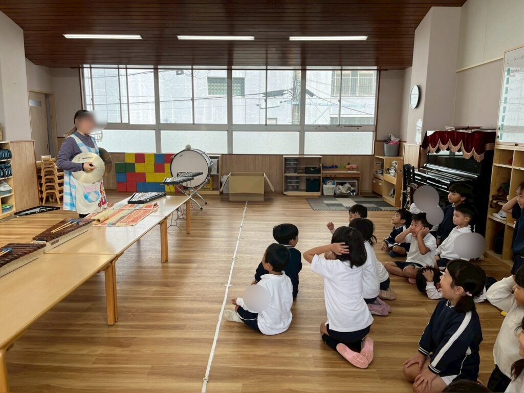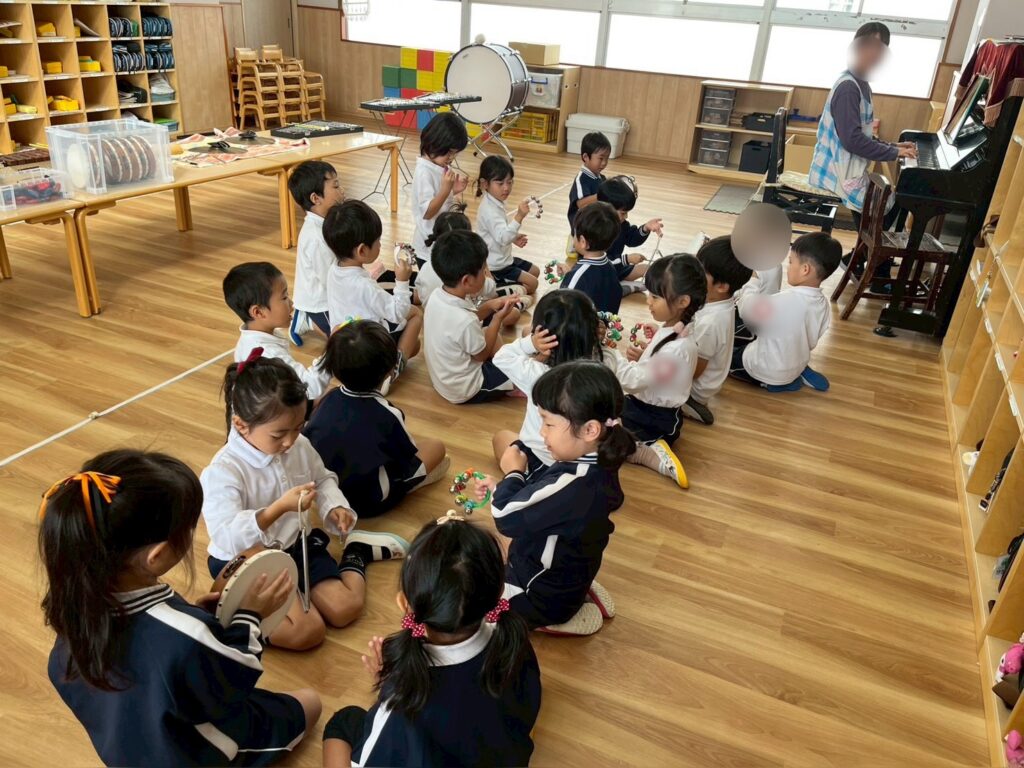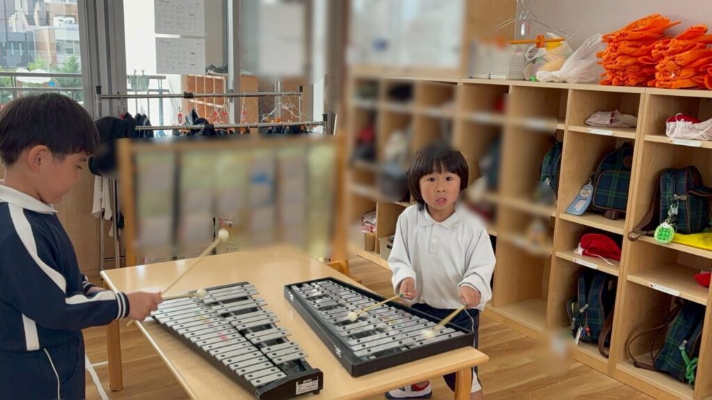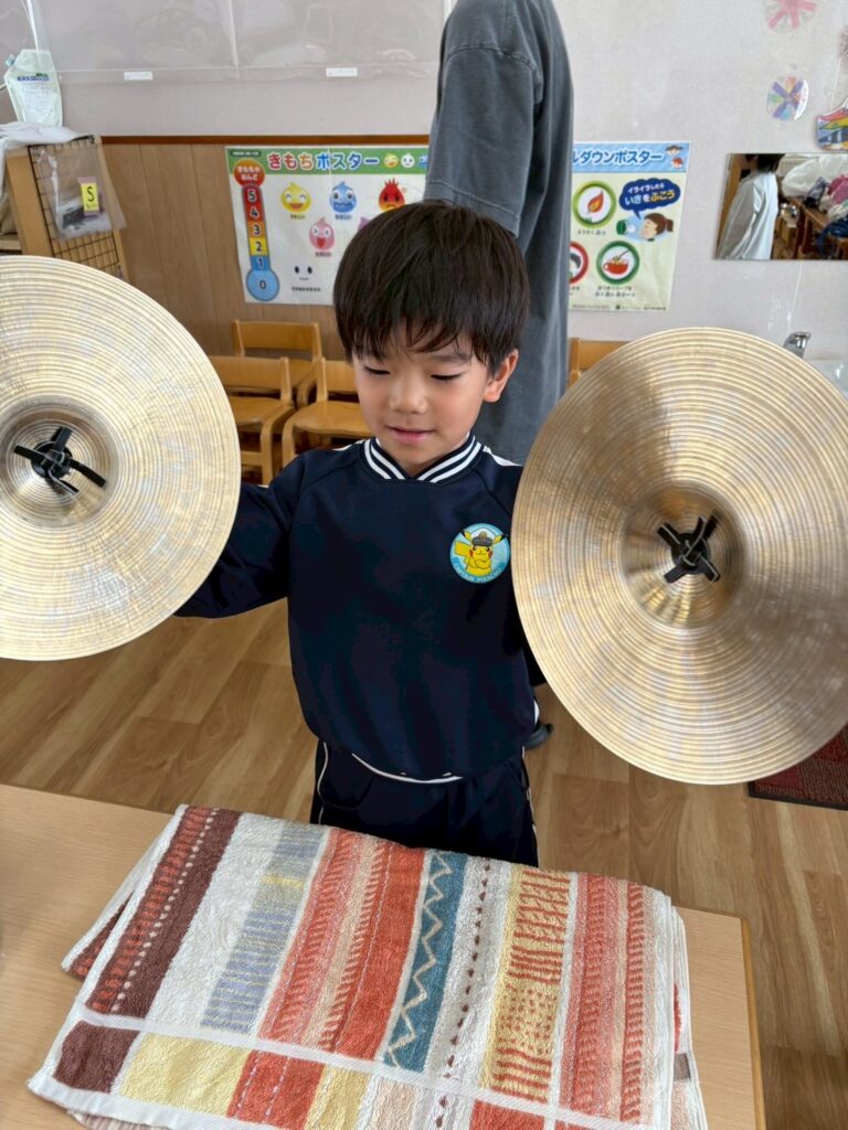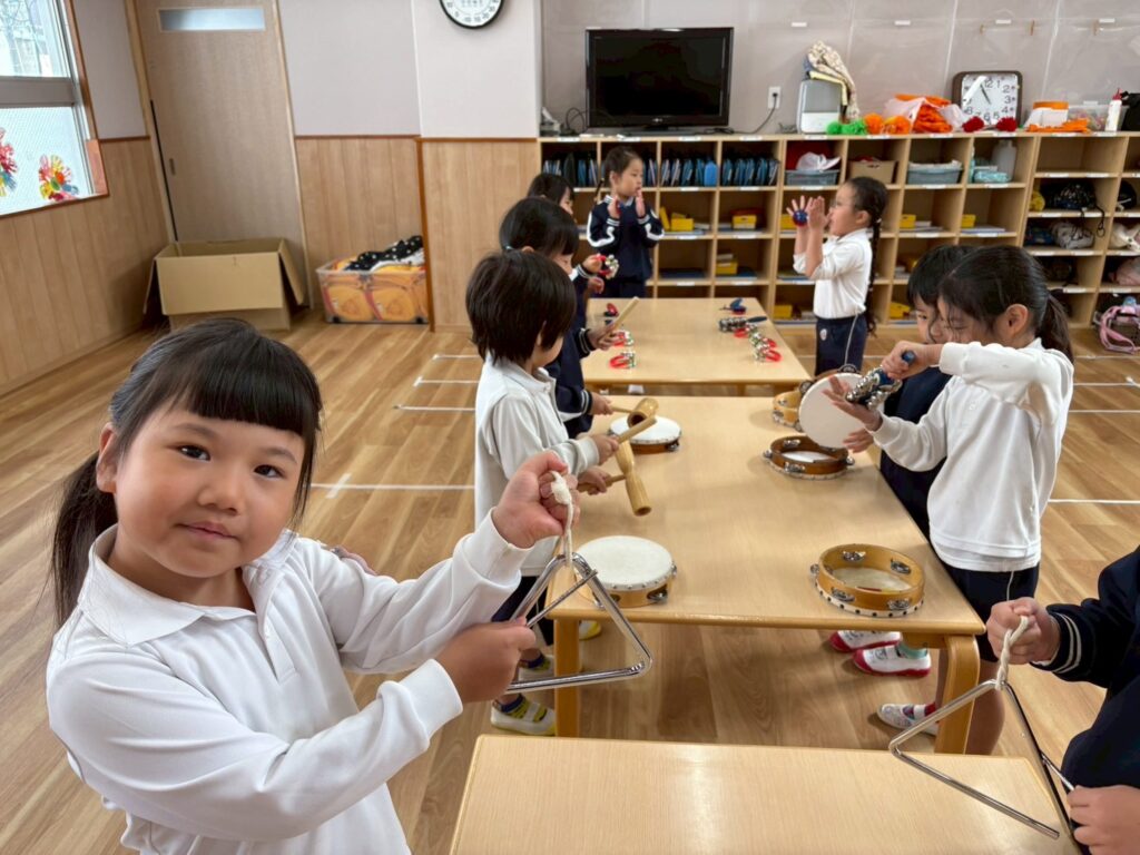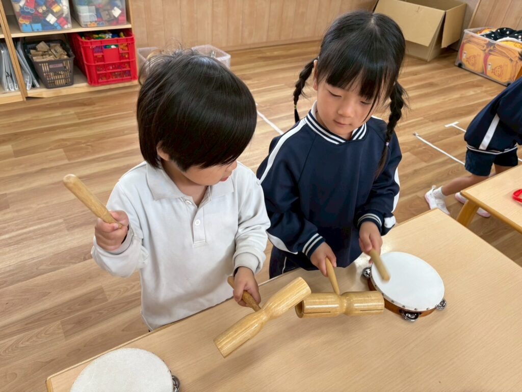 ウッドブロックにタンブリン、トライアングル、鉄筋、木琴、すず….