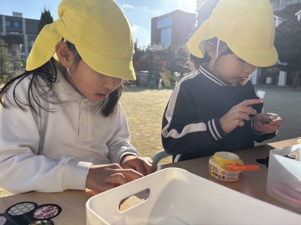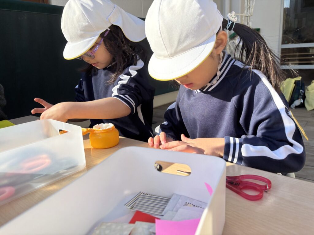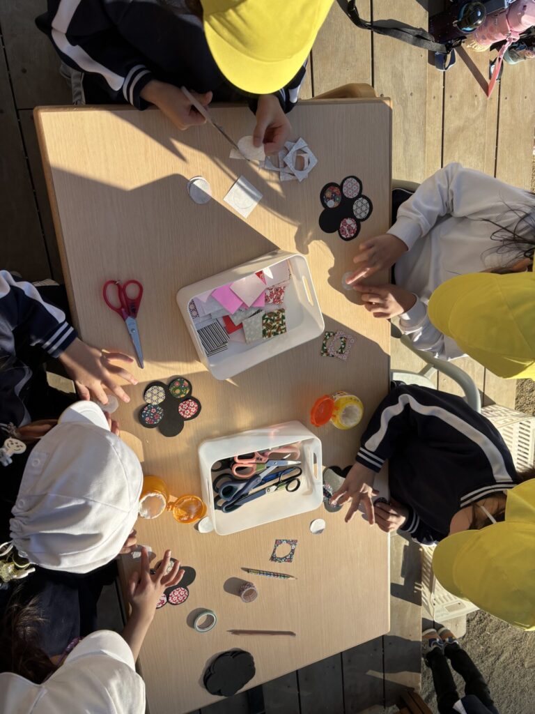 作品は幼稚園の花壇の壁に飾られています♡