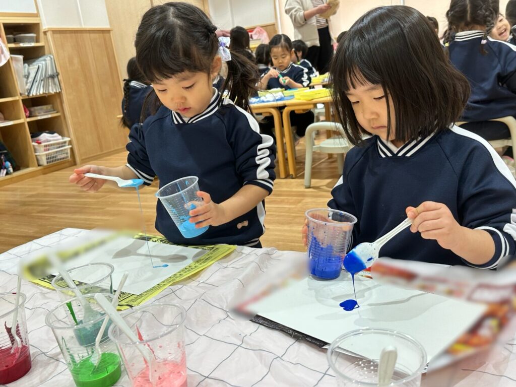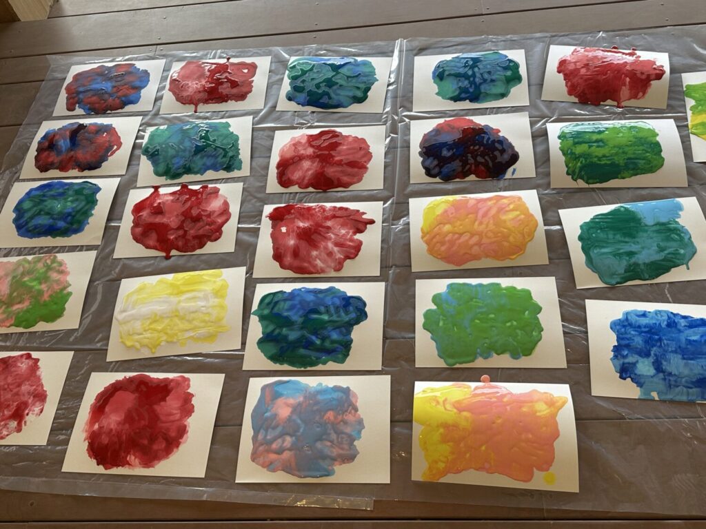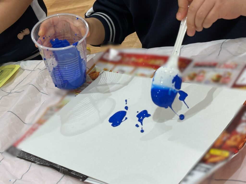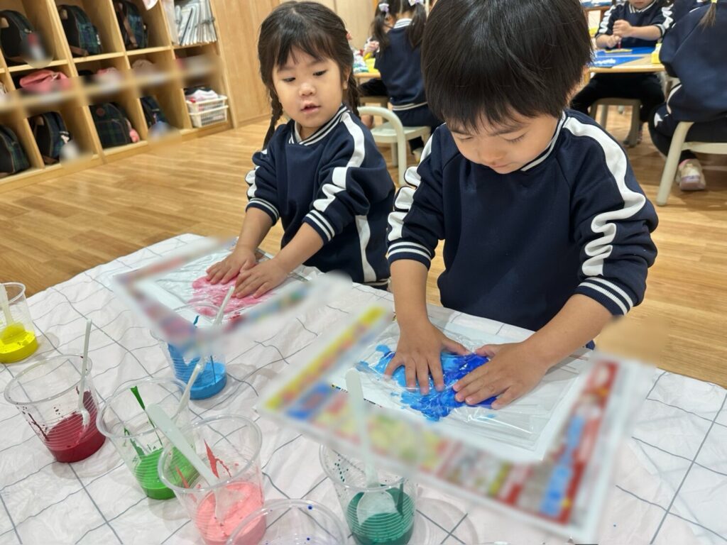 絵の具を垂らしたらビニールの上から混ぜまぜ〜🌀