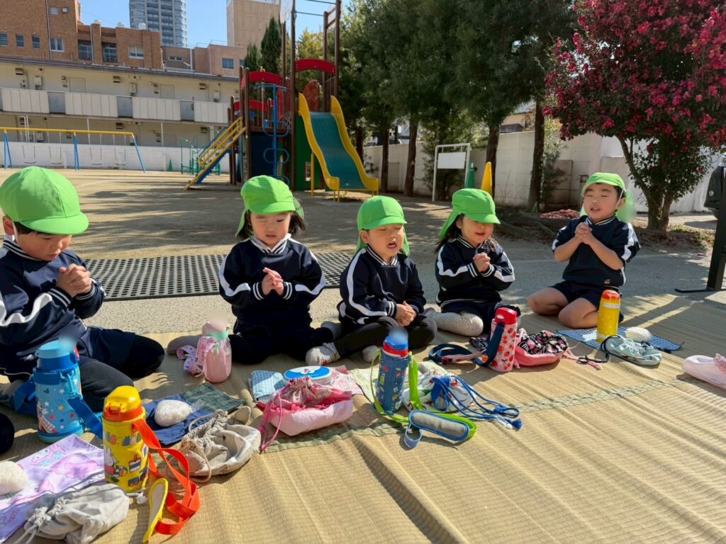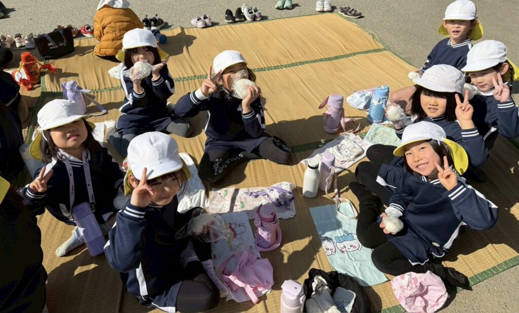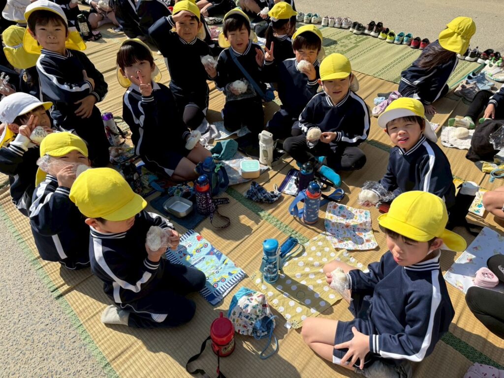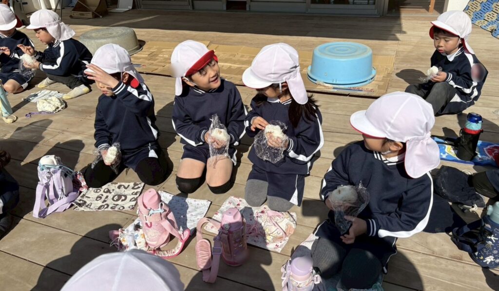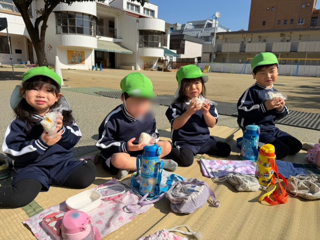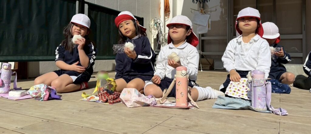 おうちの方の愛情たっぷりおにぎり🍙を頬張るひよこ組(満3歳児)さん♡